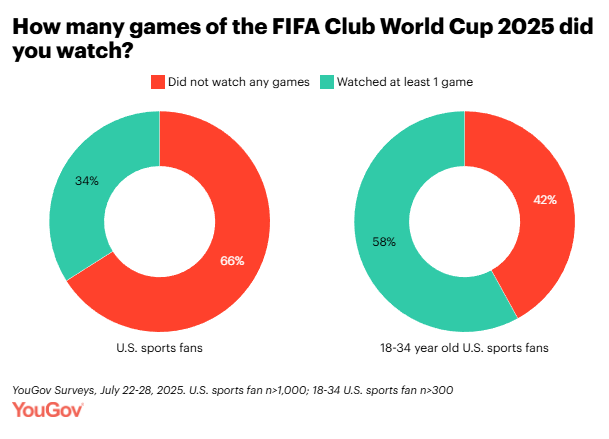 - A large majority (58%) of 18-34 year olds watched at least one 2025 FIFA Club World Cup game.