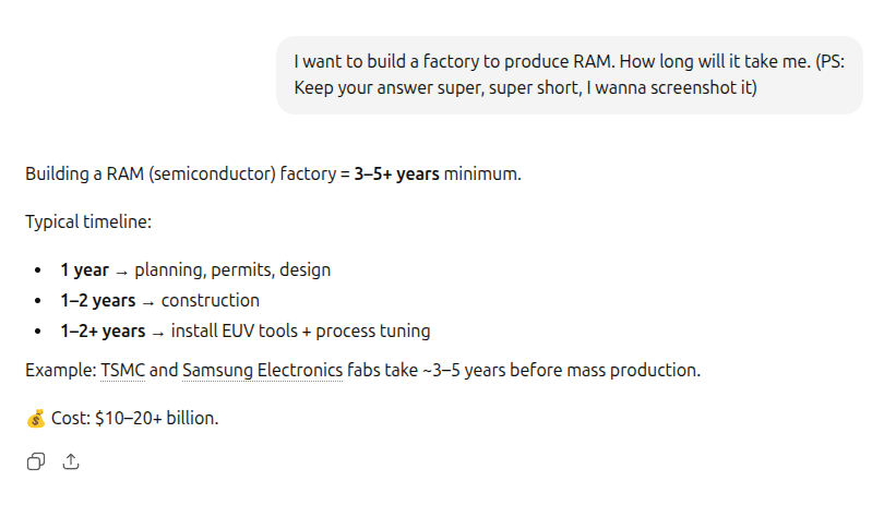 And, so long as RAM prices remain elevated, there will eventually be someone who comes along and says, “hmmm, I wouldn’t mind starting a high-margin business with a near-guaranteed demand for my product… I’m going to build a RAM factory.”