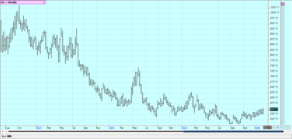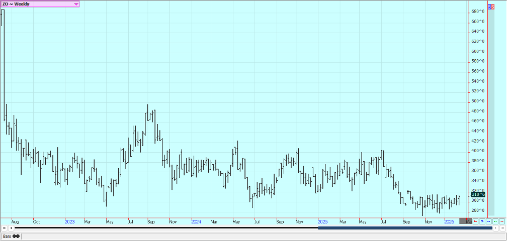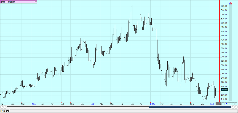 The frozen fruit is often harvested and sent to processors for juice and this fact helped to turn trends down on the weekly charts last week. Chart trends are mixed on the daily charts. The cold and dry Winter weather has created more ideas of some crop losses. Traders are worried about demand even with overall low prices. The weather is considered good for production in Brazil and Mexico. Scattered showers are reported in Brazil.