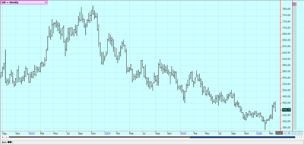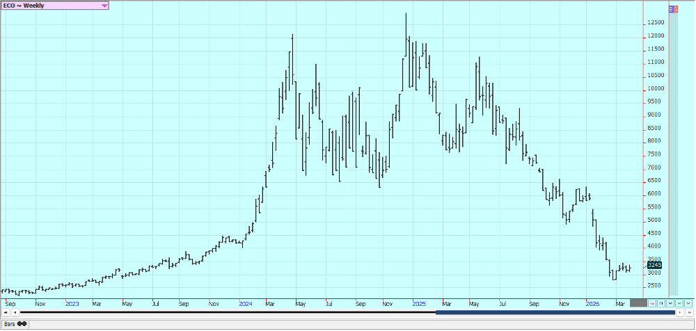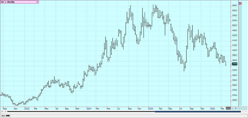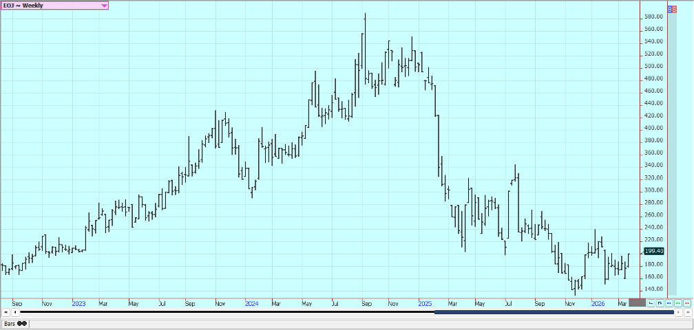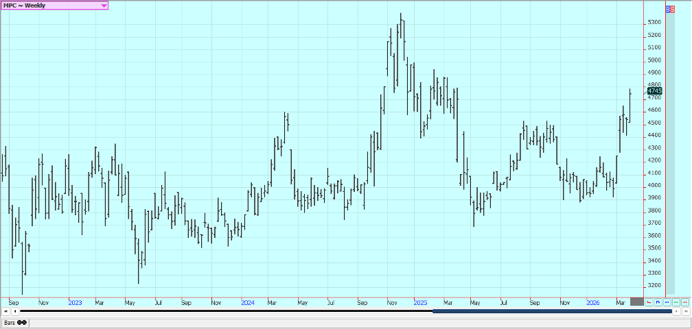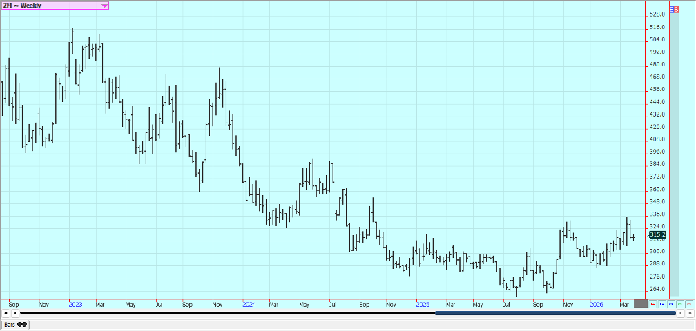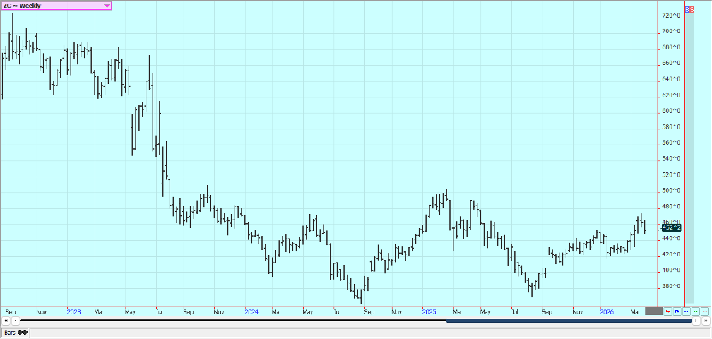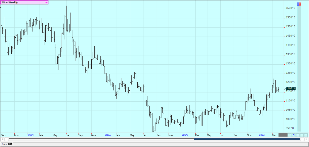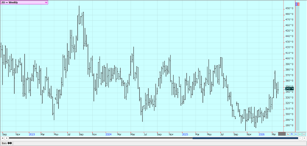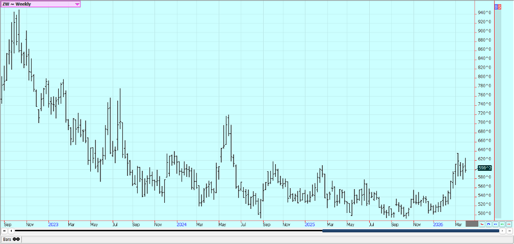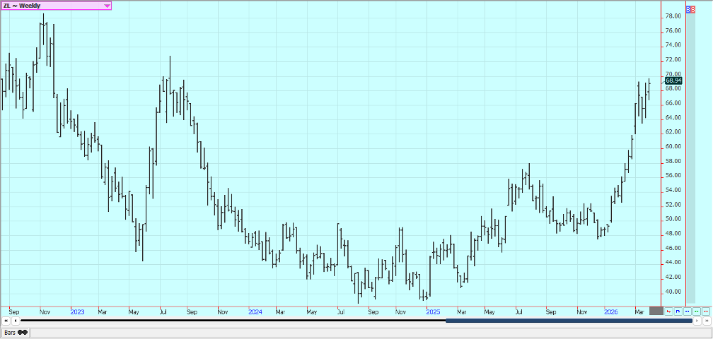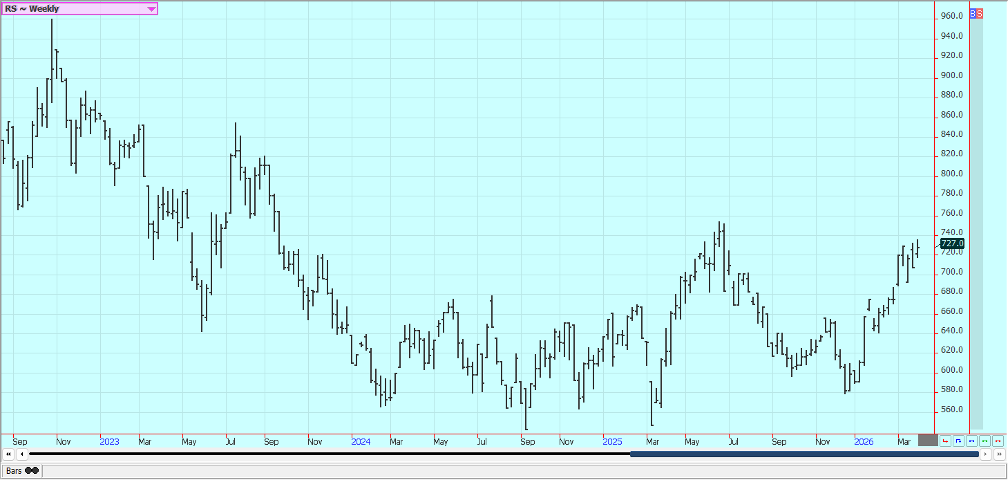 Rice: Rice closed higher last week and trends are turning up on the daily and weekly charts. The market failed at resistance on the weekly charts. Trends are still up on the daily charts after a big war related rally with the war with Iran and the political problems with China not having much effect on prices. Traders anticipate less production this year in the US and around the world due to low prices. USDA said that Rice planted area would be about 12% less in the coming year. Asian Rice prices are higher due to war concerns. Demand remains moderate for US Rice.