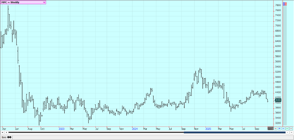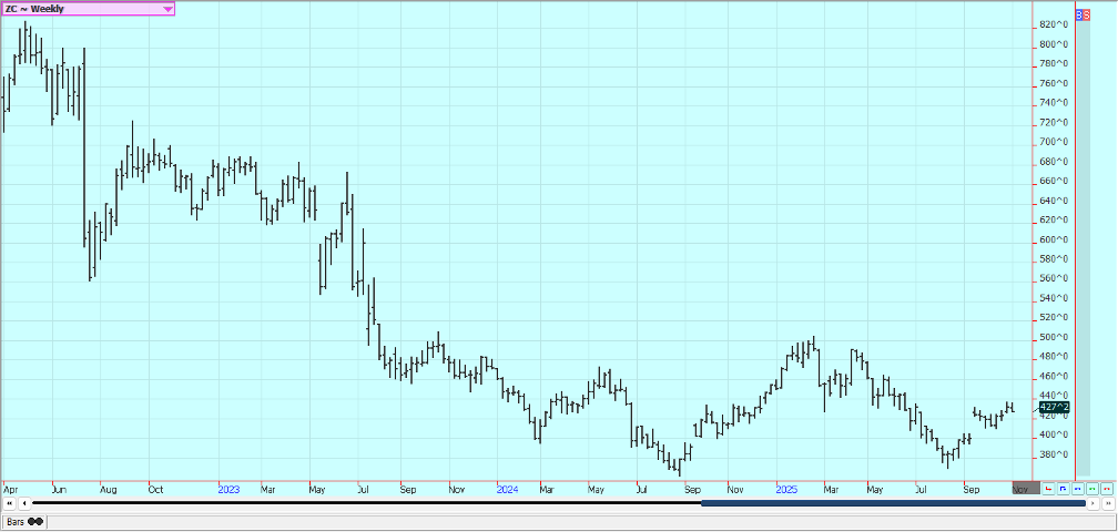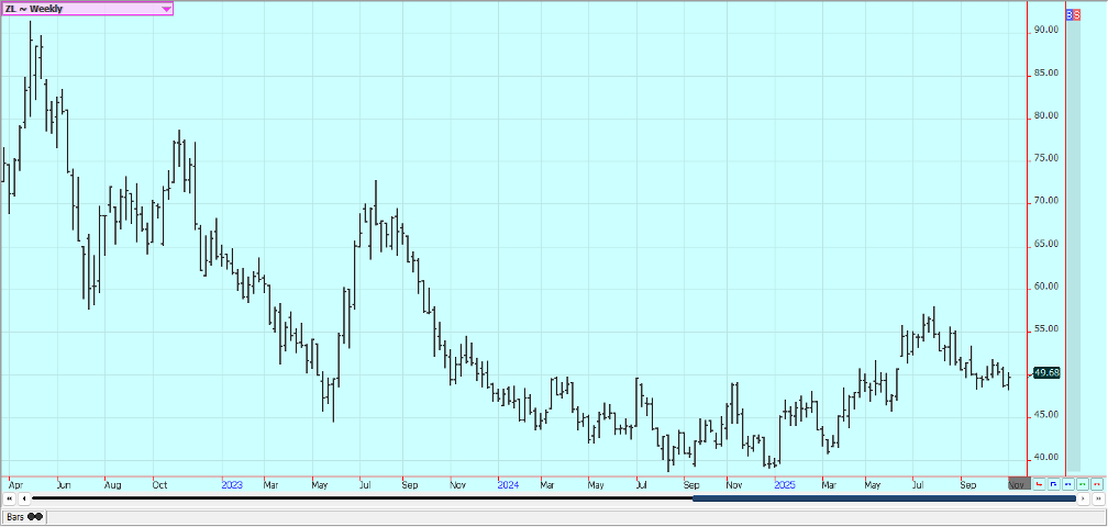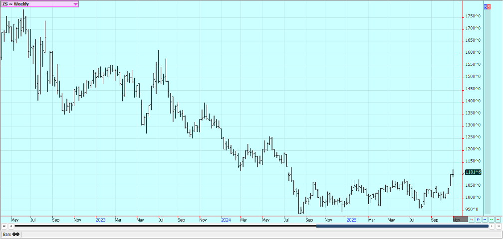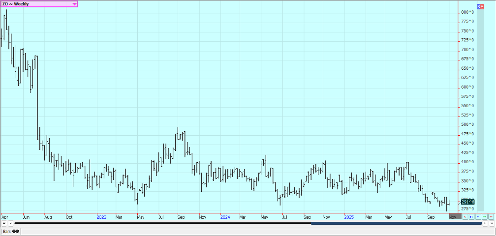 Corn: Corn was lower last week but held the recent trading range as the Supreme Court is deciding on the Trump tariffs. Trends are sideways in the market. Most USDA reports are cancelled as the government is still closed, but the November WASDE and production reports are to be issued on time later this week. There is talk in the country that Corn production is being overestimated by analysts. The harvest is winding down in all areas of the Midwest.