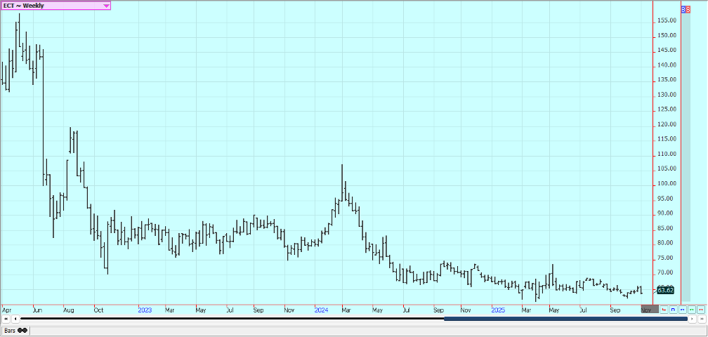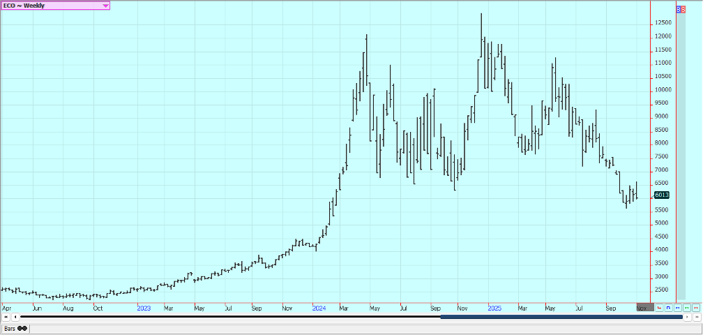 Cocoa: New York and London closed lower last week and trends are mixed to down. A big main crop harvest is anticipated in West Africa. Demand concerns in West Africa continue. Bigger supplies are expected at West Africa ports soon as Ivory Coast has raised the farmgate price paid to farmers and they are expected to sell. Ghana has also raised farmgate prices. There are still reports of increased pro-duction potential in other countries outside of West Africa, including Asia and Central America.