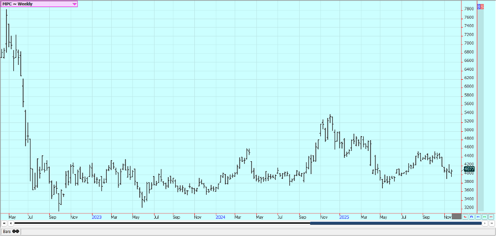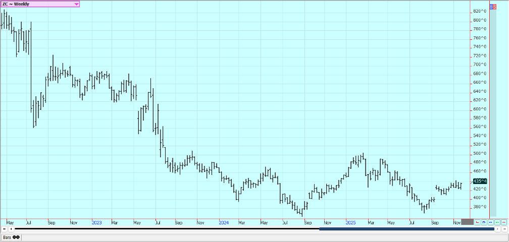 Wheat: Wheat closed a little higher in Chicago and KC last week. The weekly charts show that trends are in a short term range. World prices turned weaker last week due to reports of strong production in exporter countries. Production has been good in northern hemisphere countries. Southern hemisphere crops appear to be very good. Demand has been weaker for various origins including Russia.