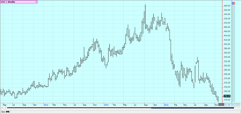 Frozen Concentrated Orange Juice and Citrus: Futures were higher last week, and the trends are mixed on the daily charts. Traders are worried about demand even with lower prices. FCOJ from Brazil has been subjected to tariffs but those have been stopped by the US for now. The weather is considered good for production here and in Brazil and Mexico. Development conditions are good in Florida and in Brazil now with occasional showers in Florida and dry weather in Brazil.