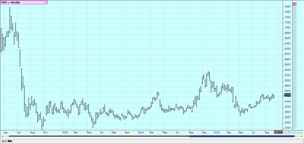 Rice: Rice was a little lower in choppy and two sided trading last week. Trends are still turning down in the market. The harvest is wrapping up in Texas and southern Louisiana. Harvest is now wrapping up in Mississippi and Arkansas. Yields and quality are mixed, but quality appears better than a year ago. The cash market has been slow with low bids from buyers in domestic markets and average or less export demand. Louisiana reports good but not great yields and quality.