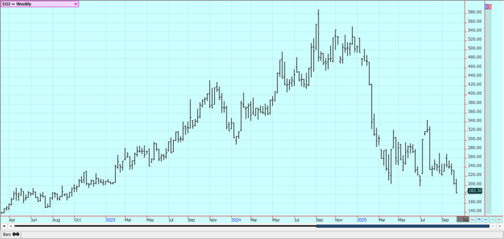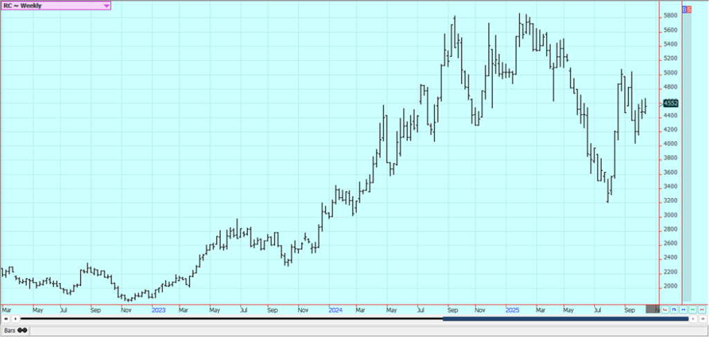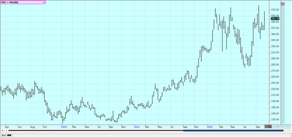 Sugar: New York and London were lower last week. Trends are still turning down in both markets. Ideas of good supplies for the market from good growing conditions for cane and beets around the world continue. Production in Center-South Brazil has also been strong. Sugar production in Center-South Brazil was stronger-than-expected during the second half of September, rising 10.8% to 3.14 millipon tons. The outlook for cane crops in India and Thailand are in good condition with reports of good rains this year, while Brazilian cane continue to favor producing sugar over ethanol.