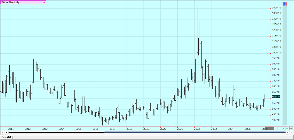 Frozen Concentrated Orange Juice and Citrus: Futures were lower last week on weather concerns Trends are mixed on the daily charts. The Florida harvest is about over and the conditions are mostly dry although isolated showers are now being reported. The weather for the next crop is dry but seasonal and some rains are starting to appear. Chart trends are mixed on the daily charts. The weather is considered good for production in Brazil and Mexico. Scattered showers are still reported in Brazil.