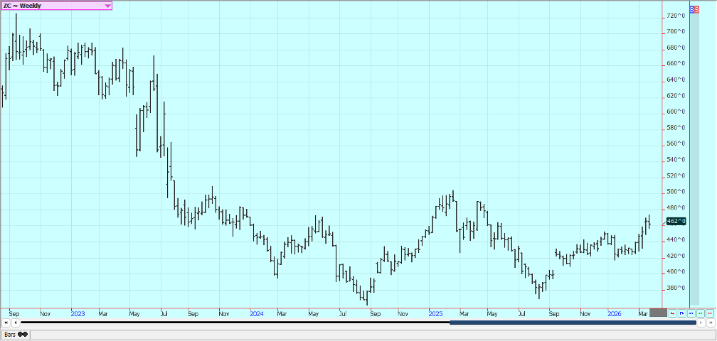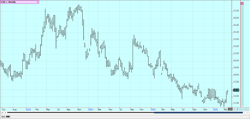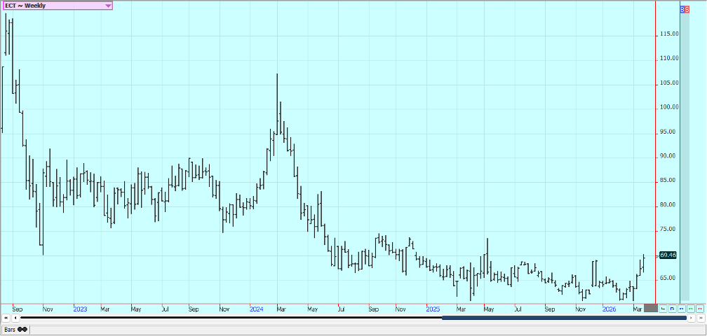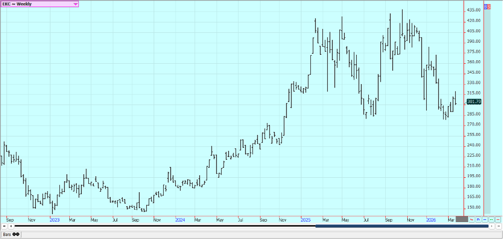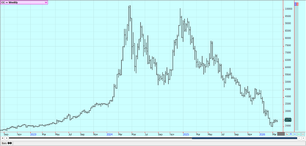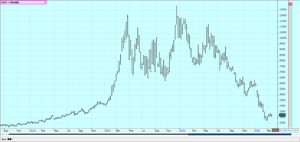 Sugar: New York was lower and London was higher in reaction to price action in petroleum futures caused in part to statements by President Trump indicating that the US and Iran are talking. Iran gas denied that there are talks and even if the war ends soon analysts expect a long time for recovery of infrastructure in the Middle East. The US is now pausing new strikes on Iean to help the talks along. The war has increased world petroleum prices and could divert demand from Sugar production to production of ethanol. Trends are mixed on the daily charts in both markets.