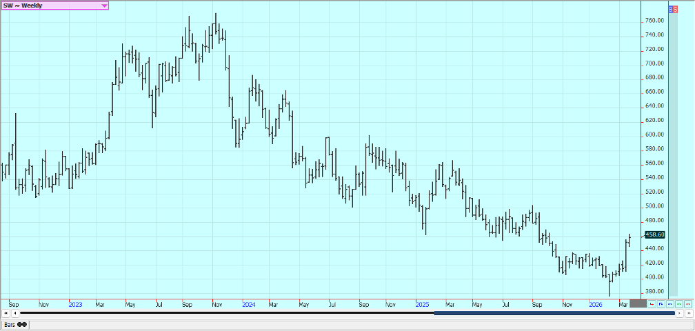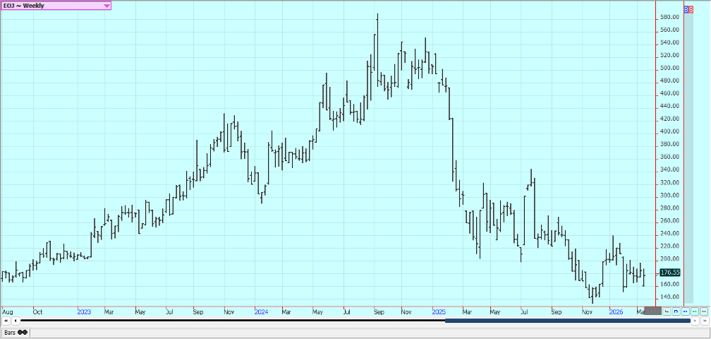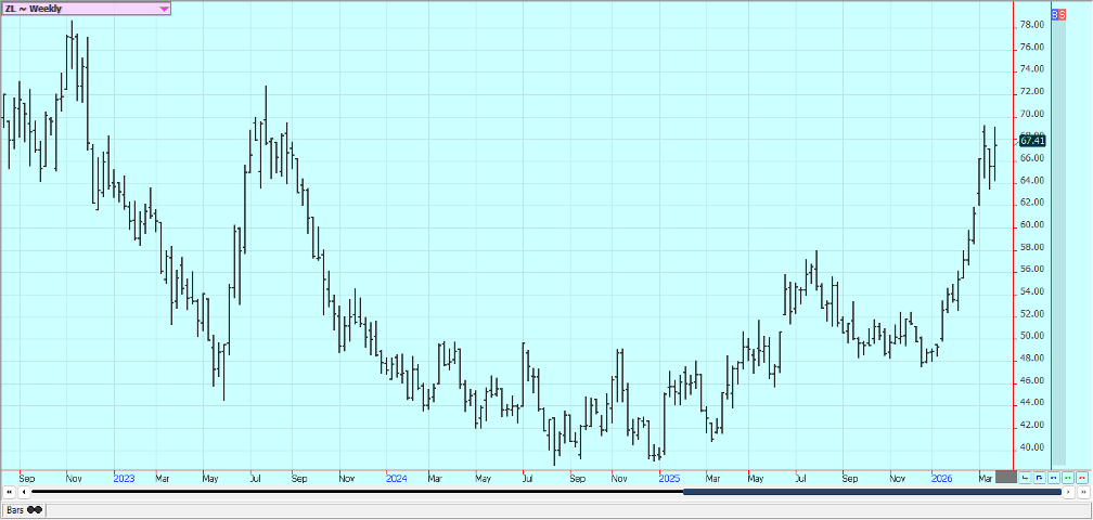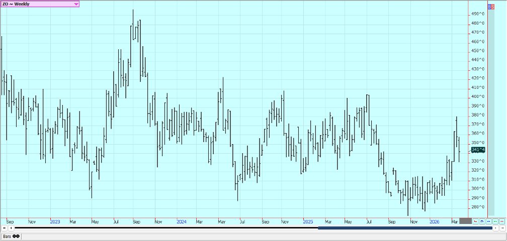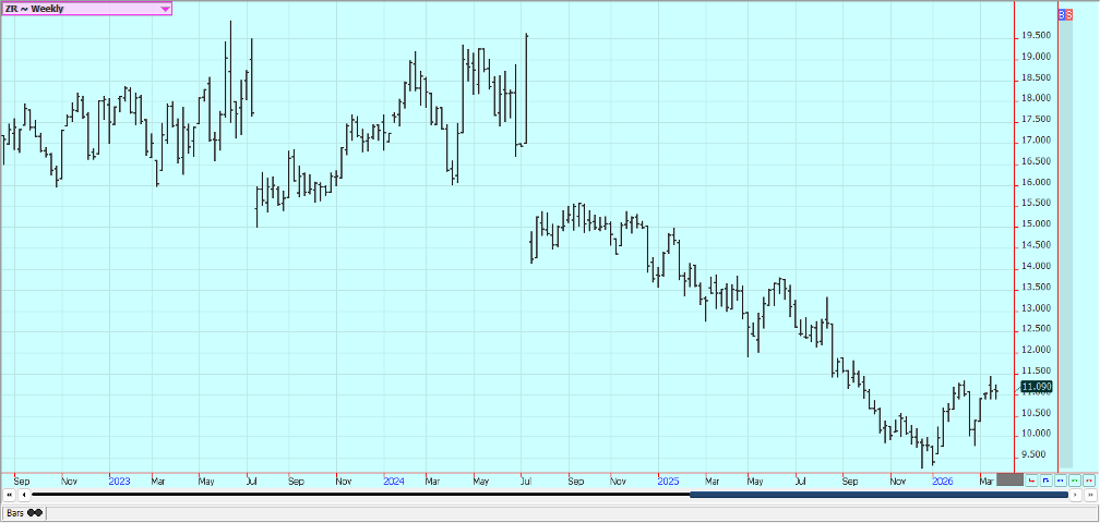 Rice: Rice closed a little lower last week and trends are mixed on the weekly charts. Trends are still up on the daily charts after a big war related rally with the war with Iran and the political problems with China not having much effect on prices.