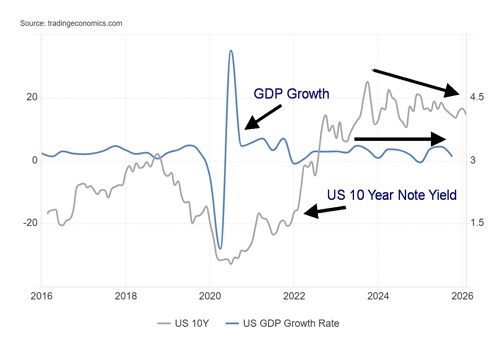 U.S. GDP Growth vs. U.S. 10-Year Treasury Note Yield 2016–2026