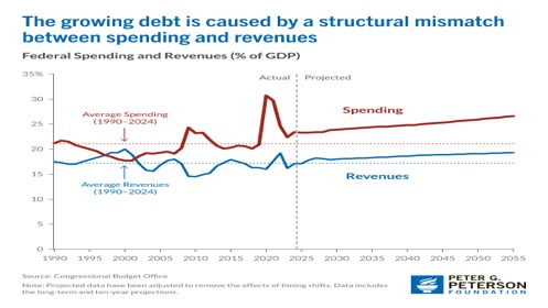 Quite simply, debt growth is on an unsustainable path. One can’t run $2 trillion deficits every year with sharply rising interest payments that also exceed your revenues. Our chart on the next page from the Peter G. Peterson Foundation (www.pgpf.org) shows how spending will continue to exceed revenues far into the future. The budget deficit as a percentage of GDP was last reported by the