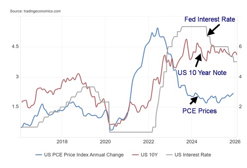 PCE Prices, Fed Interest Rate, U.S. 10-Year Note 2016–2025
