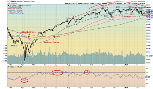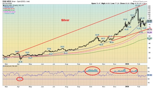 Gold continues in its corrective phase. At play this past week were the U.S.’s threats to bomb Iran and, at the end of the week, the Supreme Court striking down Trump’s tariffs. But in typical Trumpian fashion they appear to be ignoring the Supreme Court, placing a blanket 10% tariff (later raised to 15%) on the world in addition to whatever other tariffs are floating around. How that impacts some the of the deals the U.S. signed with countries (i.e., Japan, South Korea) is unknown. Also unknown, but with the potential to happen, is the return of the tariffs already collected although we wouldn’t hold our breath that will happen.