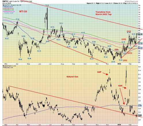 Personal Consumption Expenditures (PCE) jumped to 2.9% in December, according to the last available report: above 2.8% in November and above expectations of also 2.8%. Services were the main culprit, which were up 3.4%. This could continue to put the Fed in a quandary at its upcoming March 17–18 FOMC meeting. Especially given everything else that is happening with the Supreme Court ruling against Trump’s tariffs and threats of war against Iran (war is always inflationary).