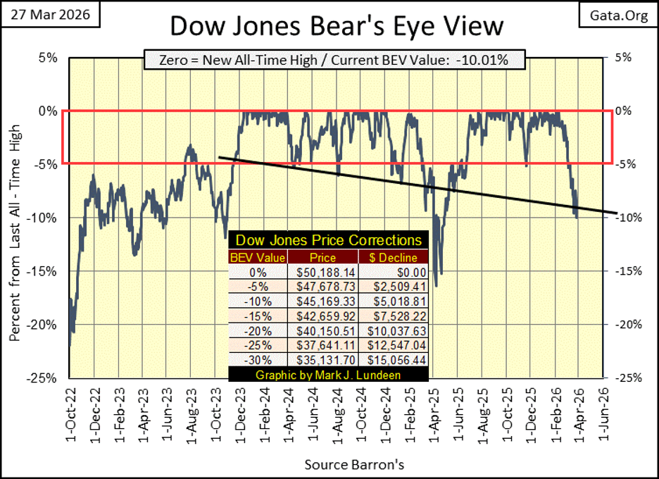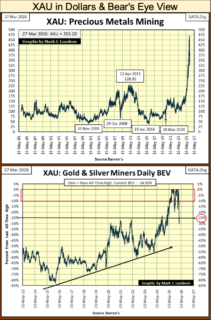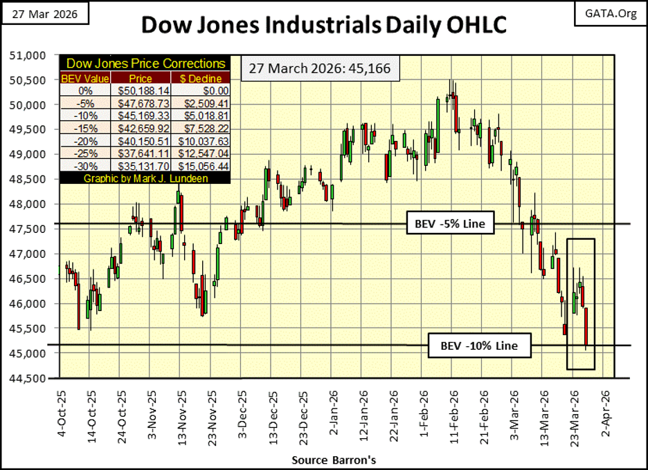 Looking at the XAU above, volatility in the XAU is much greater than it is for the Dow Jones. I think scoring position for the XAU should be above its BEV -10% line, in its BEV chart above. Anyway, how much farther can this correction go down? Maybe down to the XAU’s -40% line, and then maybe not.