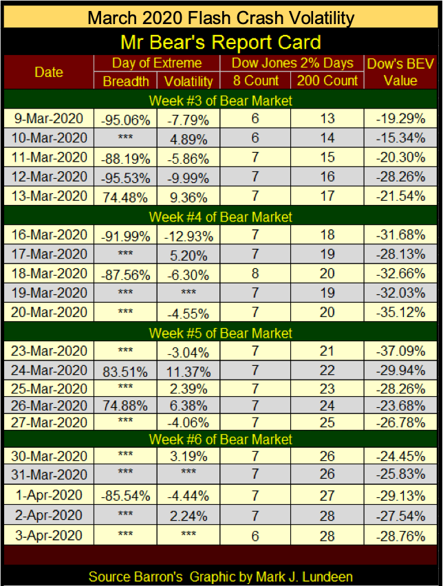 What a bear market decline looks like in terms of extreme volatility, in Dow Jones 2% days, can be seen during the March 2020 flash crash below. Look at the daily percentage moves from six years ago, moves both up and down in excess of 2% from a previous day’s close. With market volatility as we see below, no one needed me to tell them the market was crashing.