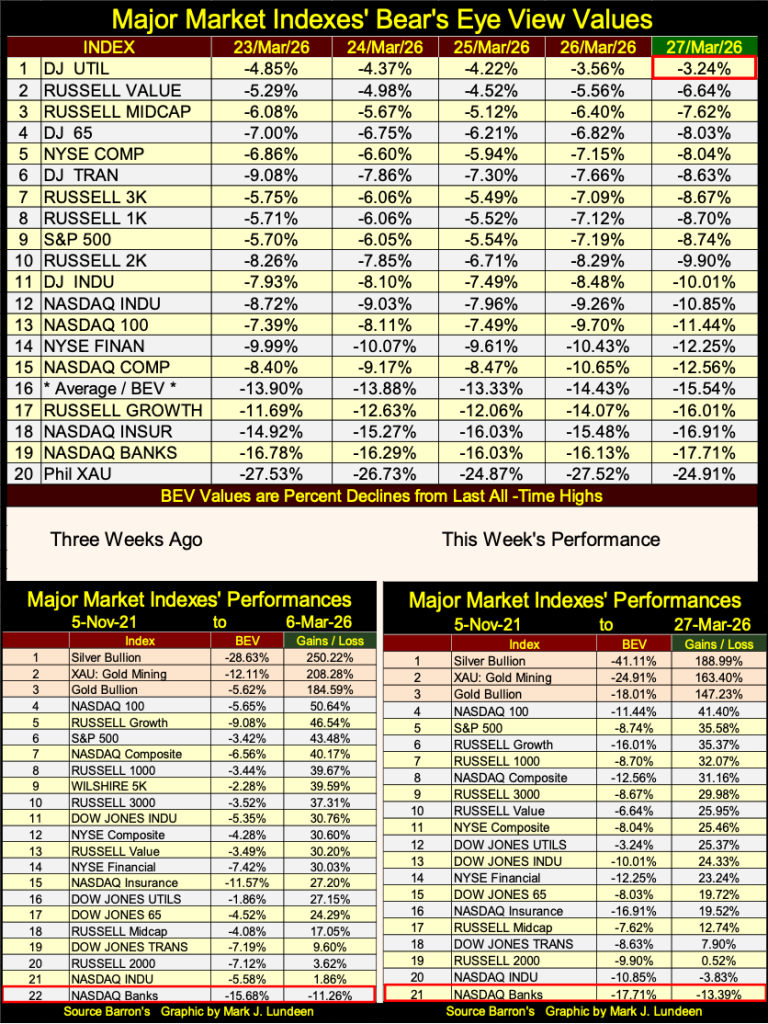 Now on to my table listing the BEV values for the major market indexes I follow. Note; the Wilshire 5000 is no longer listed, as it was discontinued. No new all-time highs seen this week, or last week. On Friday this week, only one index closed in scoring position, within 5% of its last all-time high, the Dow Jones Utility Average.