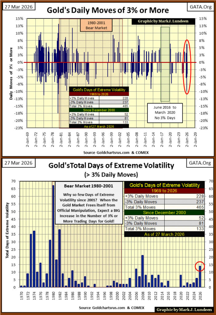 I don’t think so, and I base that on the increase in daily volatility for gold and silver. Below are two charts, plotting days of extreme volatility, days gold has moved +/- 3% from a previous day’s close. So far in 2026, 3% days for gold have come fast and furious.