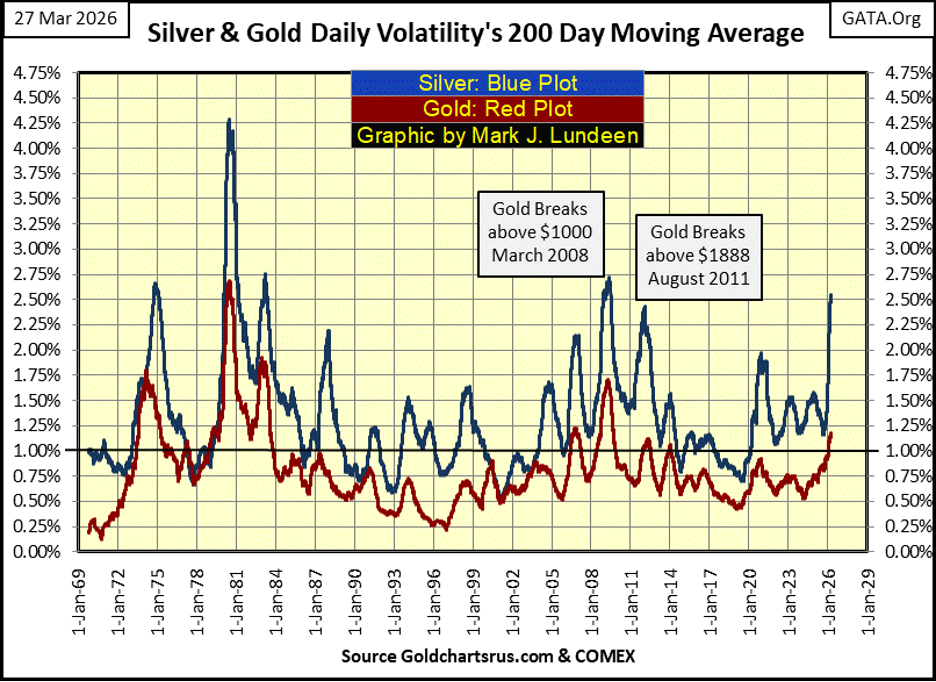 Keeping in mind that rising volatility for the stock market is * ALWAYS BEARISH. * But that is not so for gold and silver, markets that see rising volatility during both bear, and bull markets. I like to think of it this way; when funds are flowing out of gold and silver (Bear Markets) volatility rises, when funds are flowing into gold and silver (Bull Markets), volatility also rises.