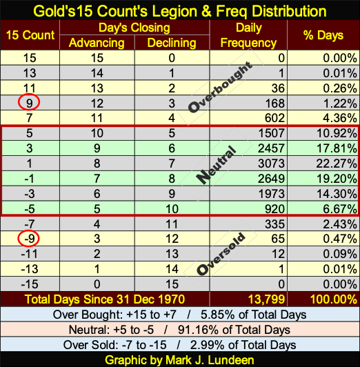 What’s with that? Maybe those nine, consecutive daily declines in the price of gold, almost two trading weeks had something to do with the sixteen day, +9 to -9 plunge in gold’s 15-count. How often does something like that happen? I don’t know, but I know what we see below on gold’s side of the table, is very unusual, something not to be seen again, for a very long time.