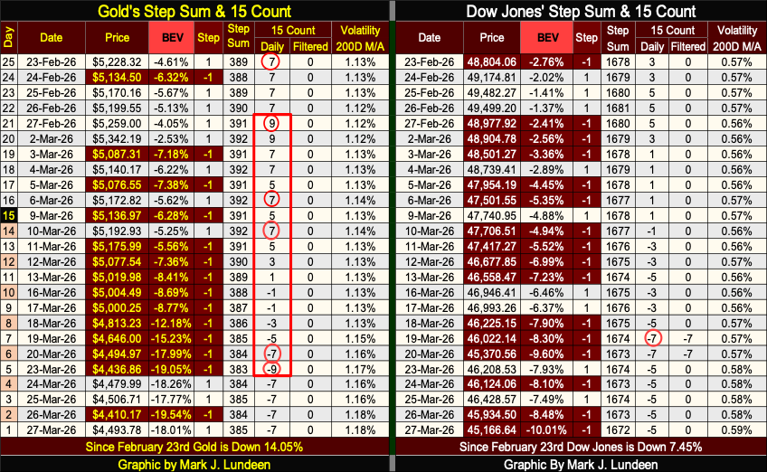Now on to gold’s step sum table below. Someone, somewhere, has placed a lot of pressure on the price of gold below. I note that gold’s 15-count went from +9, very overbought, to a -9, very oversold in only sixteen trading days in the table below.