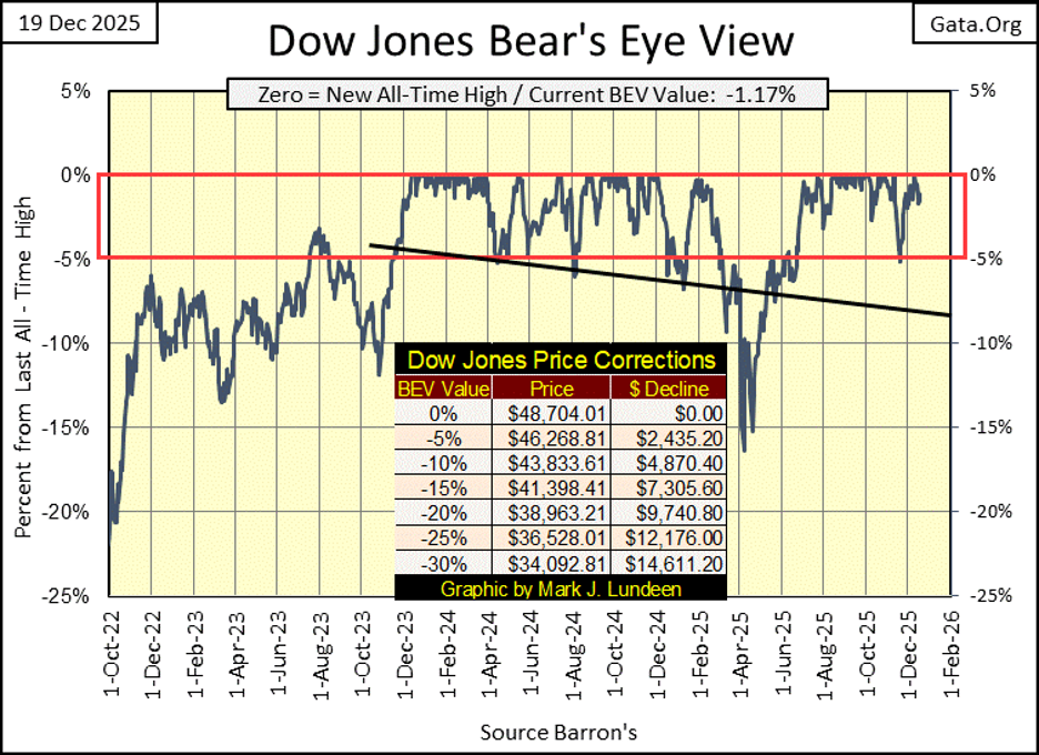 Looking at the Dow Jones in its daily bar chart below, what do I see there? It was down from last week. But no matter, as I see the Dow Jones remains well above its BEV -5% line, meaning it remains in scoring position. So, I’m still thinking we’ll see 49K on the Dow Jones, before its valuation is inflated to 50K and beyond.