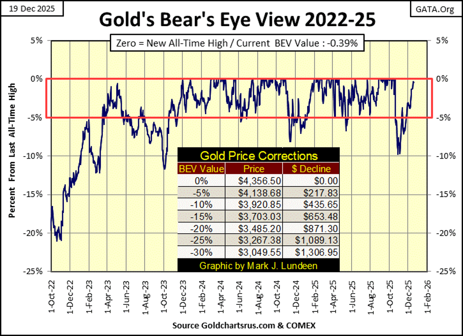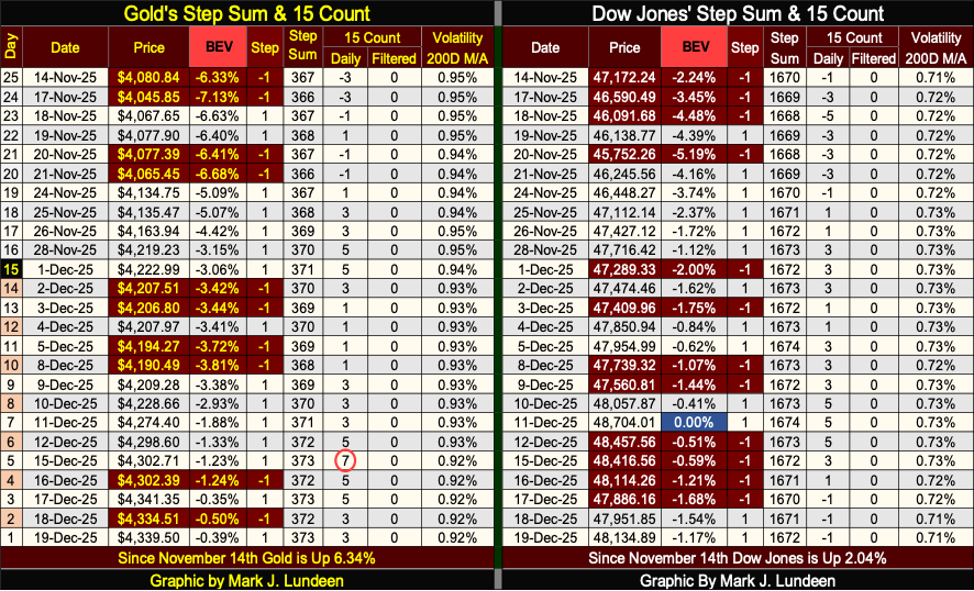 Now, for the last time in 2025, we look at gold’s step sum table below. Gold’s 15-count since November 21st, has been positive, indicating gold currently is seeing more advancing, than declining days. On December 15th, gold’s 15-count hit a +7, indicating the gold market became overbought. Markets don’t like being overbought, so declining days in the gold market increased some, and now its 15-count closed the week at a neutral +3, which is good.