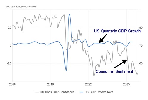 U.S. GDP Growth vs. Consumer Sentiment 2015–2025