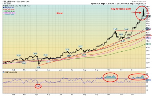 Then along came the Chicago Mercantile Exchange (CME) and, amidst concern over the growing frothiness in the precious metals markets, they raised margin requirements. That helped cause the huge hiccup decline on December 29. An outside day reversal from record highs. Silver fell nearly 9% that day. Forced liquidation. Rumours that a financial institution (unknown at this time) was going under as the result of failure to meet the margin call.