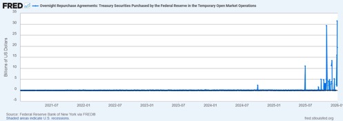 Otherwise, it was green all around. Hordes of liquidity, falling interest rates, and government deficits were major contributors. The “Liberation Day” April 2025 mini-crash was the only significant blight on the year. After that, it was on to higher levels. As we close out the year, the Fed is once again pumping the financial system with a series of repos (not seen since 2019/2020 before the pandemic crash – see chart) and clear signs that quantitative easing (QE) is once again becoming popular. Add in the odds of further rate cuts and government deficits plus insatiable borrowing, and even in 2026, markets could just keep going up. Until they don’t.