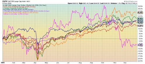 It was difficult finding any stock markets that were down in 2025. New all-time highs prevailed throughout the year. The major U.S. indices consistently made new all-time highs. Okay, except for the Dow Jones Transportations (DJT), which today is still down roughly 5% from its all-time high seen in November 2021. It is a lingering, unresolved divergence with the Dow Jones Industrials (DJI). (Dow theory says the indices must confirm each other.)