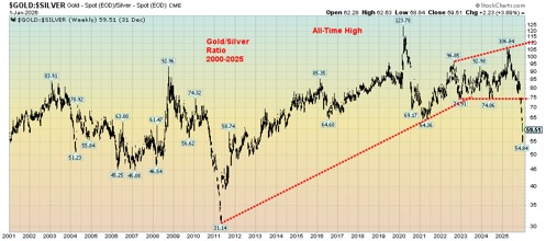 Against this background, it seems crazy that global stock markets continued to rise in 2025. But then it is the picture of the K economy: the stock market rises while consumer sentiment falls. Adding to this is job growth that has flatlined, even as the economy continues to exhibit growth thanks to consumer spending. Then there is the canary in the coal mine: precious metals (gold, silver, and platinum), the ultimate haven in times of economic stress, political polarization, fragmentation of the global world order, and massive debt.