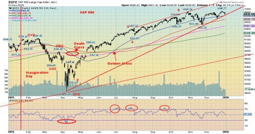 The one big thing we notice with our chart for the S&P 500 is that it, along with Dow Jones Industrials (DJI), recently saw new all-time highs, but NASDAQ did not. A divergence? Naturally, time will tell. Notably, stocks have been turning down this past week. The so-called Santa Claus rally lasts the last five days of the old year and the first two days of the new year. So far, the S&P 500 is down 1.1%. When Santa Claus fails to call, the bears may come to Broad and Wall. Except the last three years saw a mildly negative Santa Claus rally. Certainly didn’t impact 2025.
