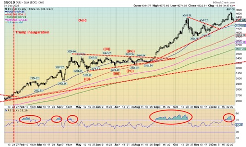 Apparently, a big winner was Palantir (PLTR), which was up some 136%. But then we ignored the mining stocks. Another big winner was Warner Bros. Discovery (WBD), up some 175%. All that was thanks to the bidding war for the company. In Canada, Celestica (CLS/TSX) gained over 190%. Of the mining and materials stocks, Orvana Minerals (ORV/TSX) stood out, up a whopping 723% in 2025. The TSX Materials Index (TMT) was up 98.2%, Metals & Mining (TGM) was up 82.5%, and Golds (TGD) were up 142.7%. Happiness all around.