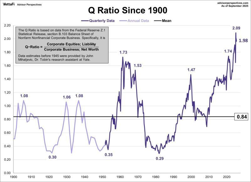 Tobin’s Q ratio stands at a lofty 1.98, the highest in a century (corporate equities, liability/corporate business, net worth). That’s 2.4 times the long-term average of 0.84. Notably high levels of the Q ratio appeared in the mid-1960s and in 2000. What followed was the 1970s’ decade of back-and-forth markets going nowhere and the 1973–1974 bear. The 2000 peak was followed by the dot.com crash and the financial crash/Great Recession. Heed the warnings.