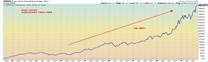 It can be difficult to pinpoint when it started, but the bottom of the market in 1921 appears to be a good place to start. From that low, the market rose an amazing 497%. It wasn’t straight up, with a 19% correction in 1923–1924 and another dip, but not as much in 1926.