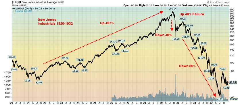 Notice as well that, while the booms of the 2010s and 2020s look good, they lag the others. Since the major low in 2009, the DJI has gone up 623%. When we compare the rise for the 1990s and the 2010s on a similar basis as the 1920s (similar time frame), we noted the 1920s rose 483%, the 1990s were up 372%, while the current period dating from the lows of 2016 is up only 182%. The pandemic collapse of 2020 may have been short-lived, but it was significant.