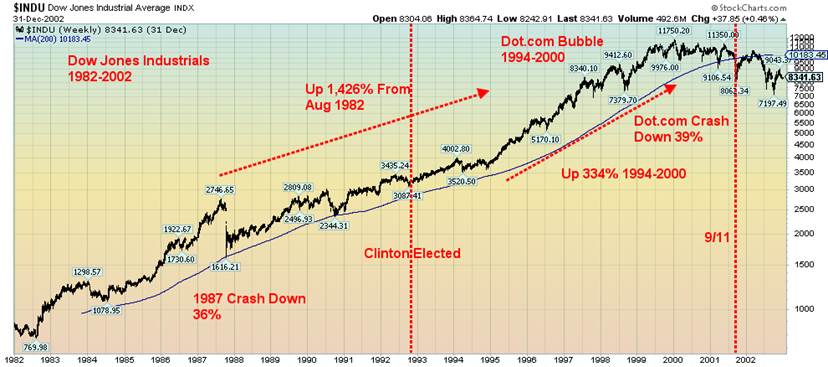 The 1920s saw a technology boom and the 1990s were no different. This time it was the internet, DVDs, text messaging, MP3 players, numerous software programs and services such as Adobe Photoshop, Google, and much more. That in turn triggered the dot.com/high-tech bubble of the 1990s. From that low in 1982 the DJI rose an incredible 1,462%. The real tech boom got underway in 1994 and from there the DJI soared 334%. The NASDAQ, where many of the high-tech companies were listed, rose 643%. In order to put the 1990s bull on a roughly equal basis with the 1920s, we went back to a key low in 1990. From there the DJI rose 372%.