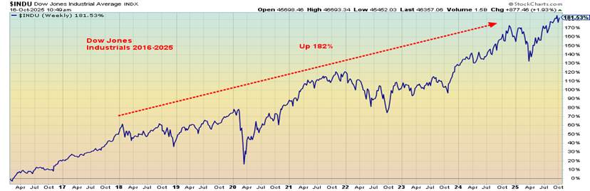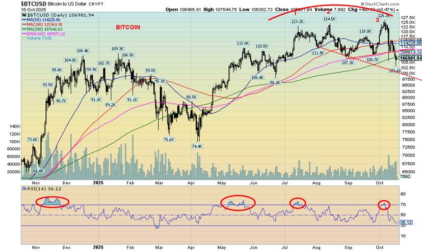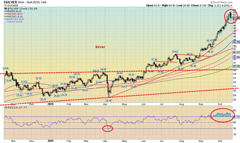 Is the bull market of 2025 coming to an end? Seems that every week we’d note new all-time highs. Not this week as, following the sharp down reversal last Friday, October 10, we rebounded but have so far failed to regain the highs. Is the bloom off AI? Well, not quite as the NY FANG Index made new all-time highs but MAGS the MAG7 ETF failed to make new highs. Maybe Advanced Micro helped the FANG Index as AMD gained 8.5% on the week. Broadcom was up 7.6% so that probably helped as well. Neither are members of MAGS. We don’t want to get too bearish too soon as we’ve been burned before. But this seems to be the first time in weeks we are not making new all-time highs.