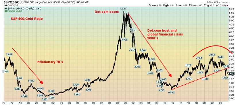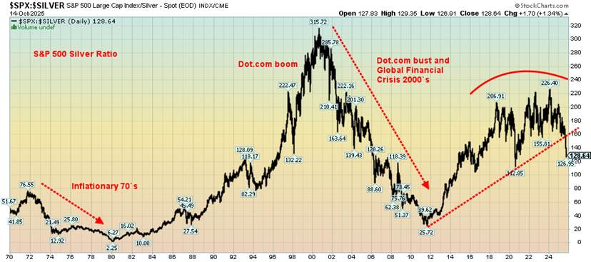 After the ratio bottomed in 2011 with gold over $1,900 and silver again near $50, a period followed where stocks ruled over gold and silver, thanks to ultra-low interest rates and QE. The wars in Afghanistan and Iraq continued but eventually ended. We now appear to be culminating in the AI bubble, not dissimilar to what happened in the late 1990s. It’s against the background of geopolitical and domestic political instability. Both the SPX/Gold ratio and the SPX/Silver ratio have now firmly broken to the downside, suggesting another period of gold and silver outperforming stocks.