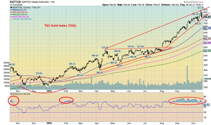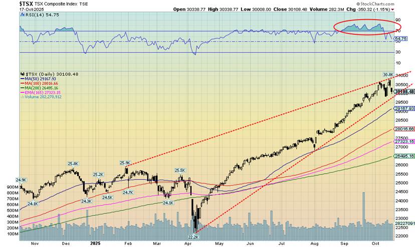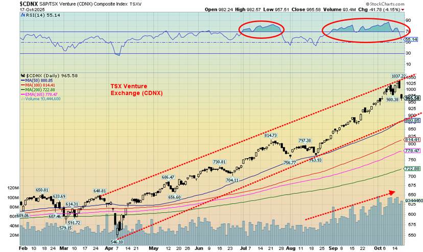 The Canadian stock markets need a breather from their breakneck runs to new highs/all-time highs. The pause that refreshes. Could it be a major top? Yes, but for that we need the TSX and the CDNX to bust the April 2025 low to confirm.