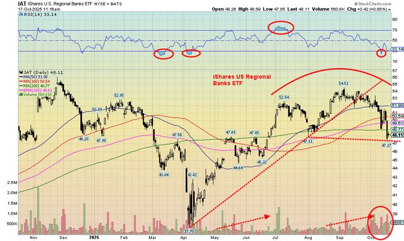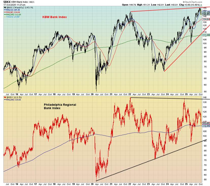 Shakiness in the banking industry, particularly with the regional banks, and the collapse of subprime auto lender Tricolor and the auto parts supplier First Brands helped push bond yields lower this past week. Banks such as JP Morgan Chase announced loan losses. Bond yields are also falling because of trouble in the labour market as claims are soaring (if we could actually get the numbers, given the BLS is shut down).