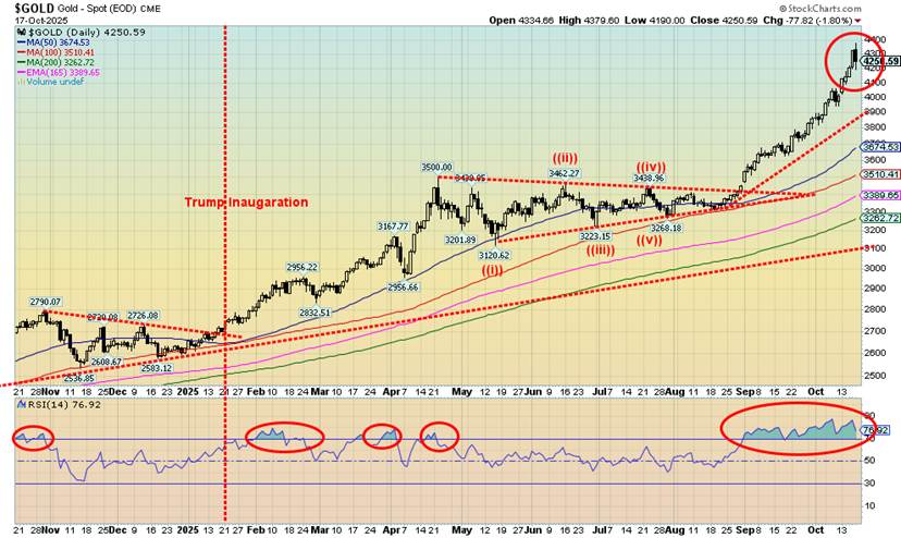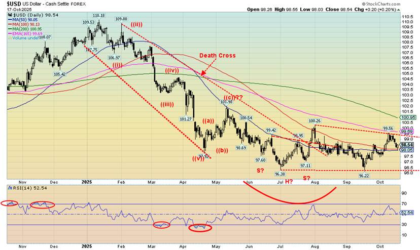 Our scorecard since Inauguration Day on January 20, 2025 remains the same. Gold is comfortably in the lead, up 57.4%, while oil brings up the rear, down 25.5%. Everybody else appears to be turning down. Bitcoin is close to turning negative. Gold took that tumble on Friday but, as we will explain, we need a further decline to suggest a top. The US$ Index is the only other one in negative territory, down 9.9%.