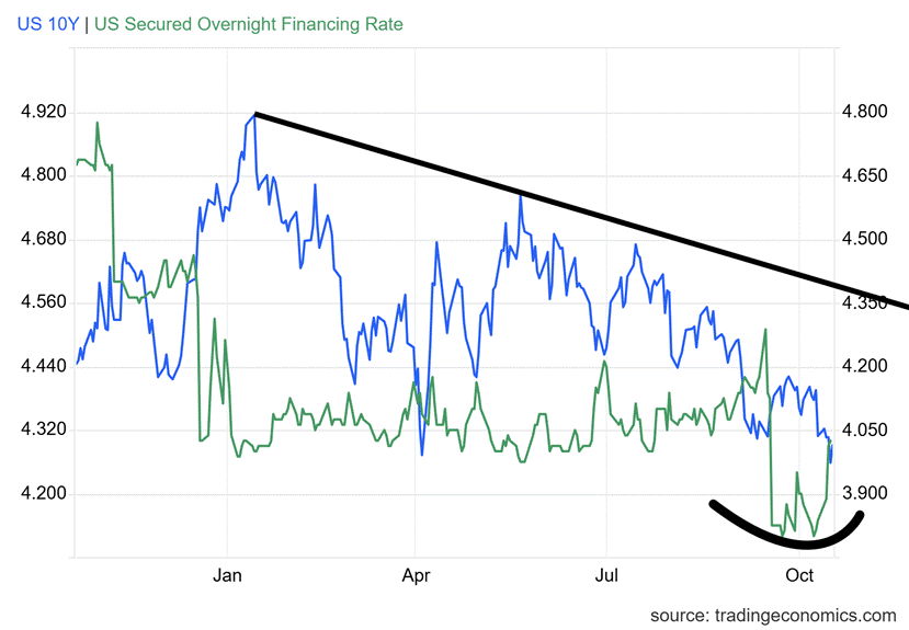 Overnight money being higher suggests a tightening of credit in the market. The rate is now also above the Fed’s target rate of 4.25%. That is rare, but it reflects the growing troubles in the bank and labour markets.