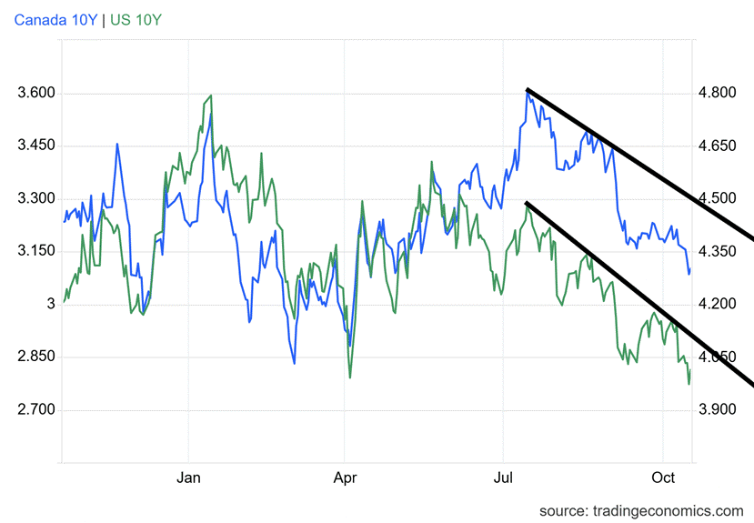 The U.S. economy may be slowing further, but we won’t know for sure until the government shutdown ends, given it shows no sign of opening again as the two sides are dug in and blaming each other. The drop in yield was small, from 4.05% to 4.01%, but still significant. Canada fell further, down to 3.10% from 3.17% as BofC Governor Tiff Macklem is signalling the potential for further rate cuts, given we aren’t yet seeing the impact of the trade wars. Canada contracted 1.6% in Q2. But, taken with Q1, Canada did eke out slight growth.