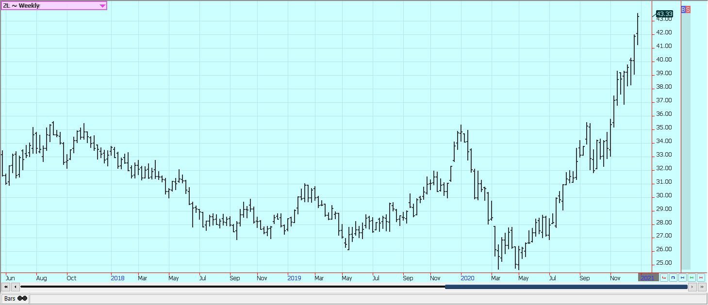 Palm Oil closed higher and made a new high weekly close once again last week. The market was supported by ideas of tight supplies coming down the road. Production of most vegetable oils in the world is less this year due to a lack of production of oilseeds. The production of Palm Oil is down in both Malaysia and Indonesia as plantations in both countries are having trouble getting workers into the fields. Export demand has been strong and ethanol demand has been moderate. Soybean Oil and Canola were higher on strong demand ideas. Production problems for Soybeans in South America helped Soybean Oil, but the resolution of the dock and oilseeds workers strikes in Argentina pushed prices a little lower for a day. Very strong Palm Oil prices have made buying Soybean and Canola oils the better option. Trends are up in Soybean Oil and in Canola. Demand for Canola has improved in recent weeks and farm selling has been less.