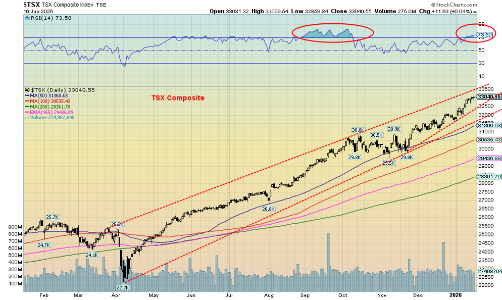 The records keep falling as, once again, the TSX Composite rose to record highs, up 1.3% on the week and now up 4.2% in 2026. Not to be left behind, the TSX Venture Exchange (CDNX) rose 3.7% and is now up 10.5% in 2026. At 1,091, however, the CDNX remains well off its all-time high of 3,372 seen in 2007. The CDNX has lots of room to move higher. It is, of course, dominated by junior mining development stocks (gold, silver, metals). Of the 14 sub-indices, nine rose while five fell this past week. The big winners all making new all-time highs were Golds (TGD) +4.9%, Metals & Mining (TGM) +5.2%, and Materials (TMT) +4.3%.