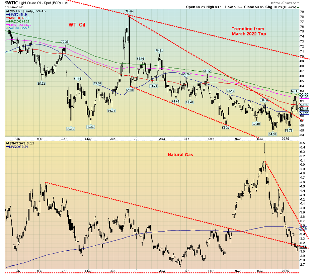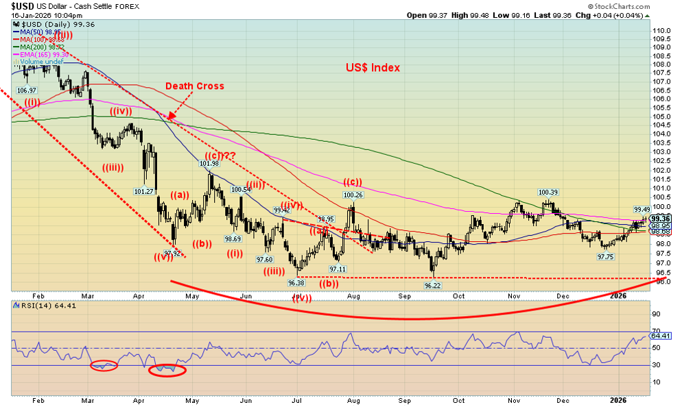 Failure here would refocus us on the recent low at 97.75. Under 97.20 new lows below 96.22 come into focus. How the US$ Index goes also impacts gold. However, of late gold has been largely ignoring the rise in the US$ Index, sometimes in tandem with the US$ Index. The US$ Index continues its woes as it fell over 9% in 2025 and is not looking particularly good for this year.
