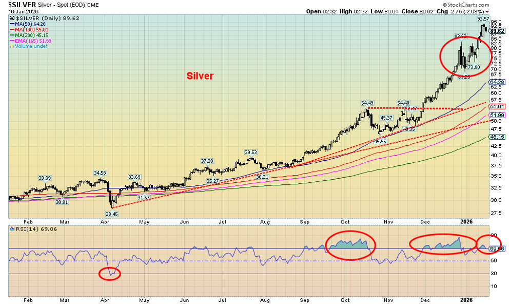 Hi-ho silver, away! Just when you thought that silver was about to have a steep correction, given that outside day key reversal on December 29, 2025, the signal slammed back in our face. Silver turned and raced once again to new all-time highs, this time up to $93.57, even as we closed mildly lower at $89.62. It looks like $100 silver is now in the headlights. Admittedly, we do get concerned by excited calls for silver to rise to $200, $300, $400, and even $600. Silver fever?