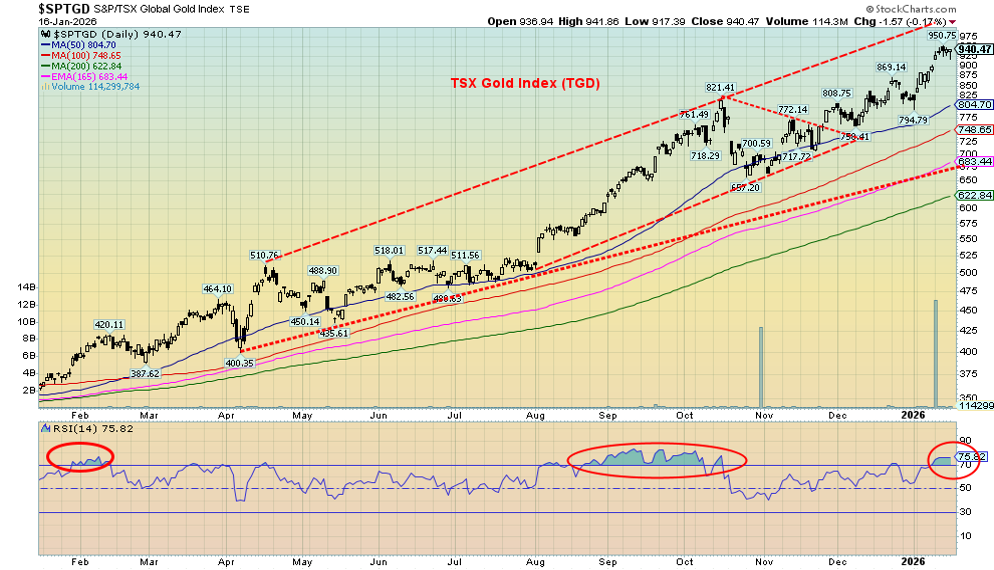 The gold stocks continue to go up, continuing where they left off in 2025. Already this year the Gold Bugs Index (HUI) is up 14.4% while the TSX Gold Index (TGD) is up 15.0%. Nice start to 2026. On the week, we jumped, then wobbled as the TGD rose 4.8% and the HUI rose 5.1%. Both indices made new all-time highs as did several individual gold stocks. Life continues to percolate with the junior gold/silver mining explorers. It is with them the real big gains can be made; however, they come with elevated risk.